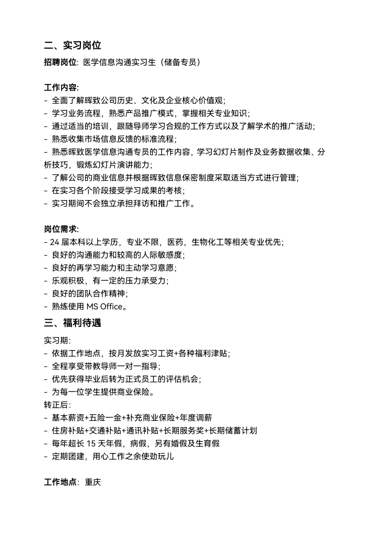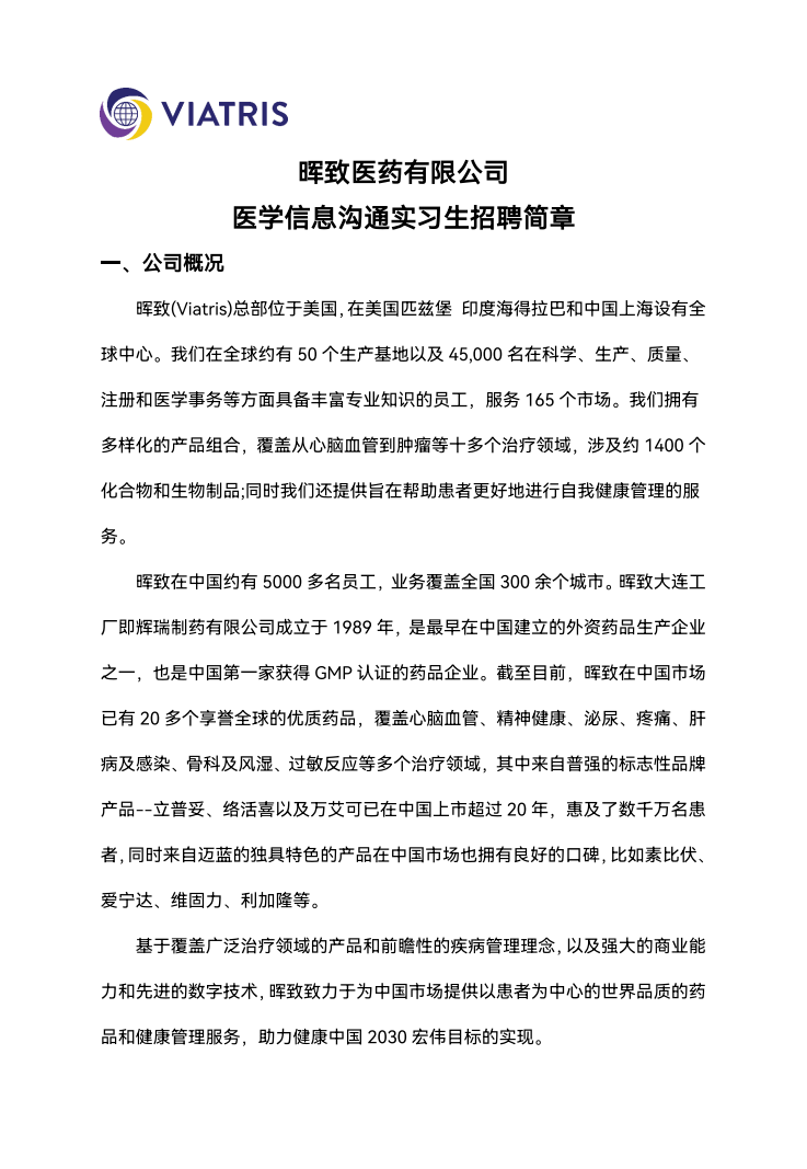 晖致医药有限公司 医学信息沟通实习生招聘简章